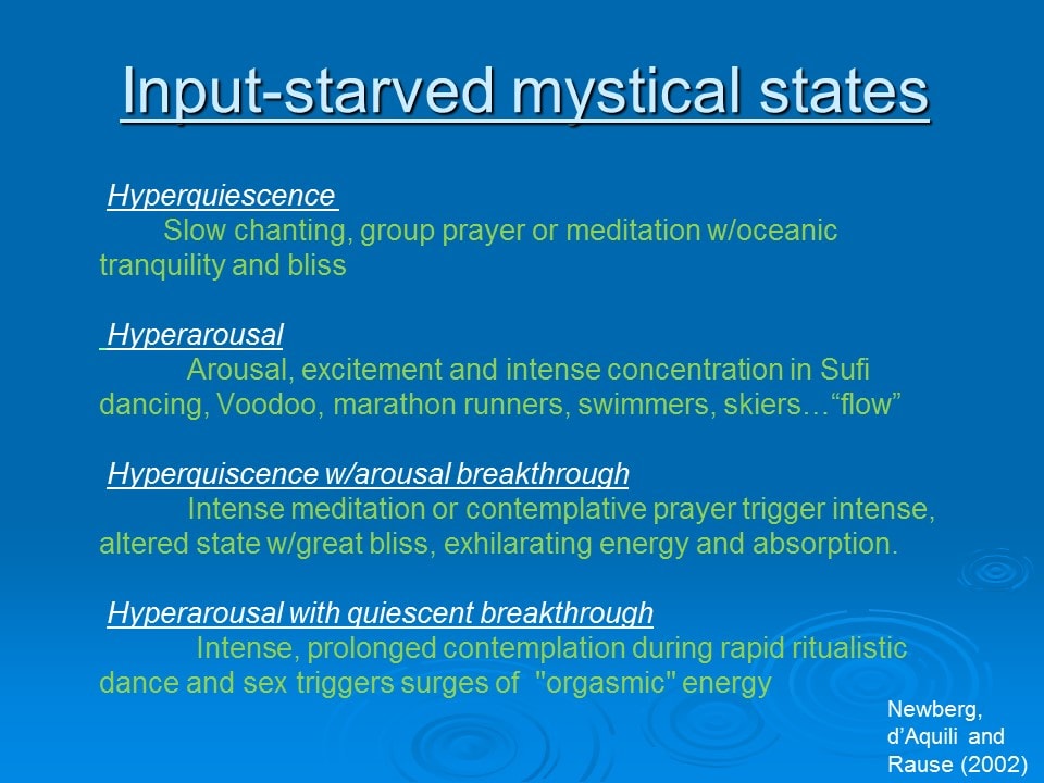 How this manifests in these input starved mystical states? They’ve got two books or three or four books, you can look them up in any place. Hyperquiescence — you get very, very, very still. Hyperarousal, obviously the opposite — marathon runners, voodoo, swimmers, skiers, whatever… It’s flow, we all know about flow, Gladwell’s book [possibly a mistake, “Flow” is a book by Mihaly Csikszentmihalyi]. Hyperquiescence with arousal breakthrough — you get really, really, really quiet and then — bang, something happens. You get a breakthrough and you get great bliss, exhilarating energy and absorption. The converse of that is “hyperarousal with quiescent breakthrough”.