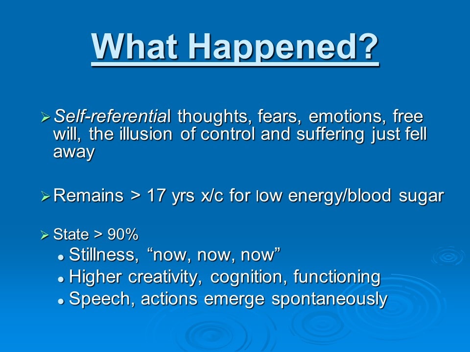 Something I hadn’t expected were these two: “free will” and “the illusion of control”. I was very active in corporate industry and I was certain, very certain, in fact, that I had control and I had absolute free will and all that happens: successes and failures were mine. My responsibility. My failures. My successes. And when “I” fell away — just like that, snap — it just fell away right along with everything else.