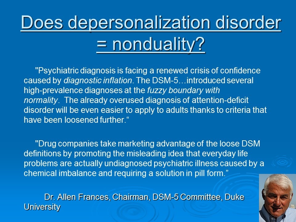 Take one of the big Obi-Wans in depersonalization disorder, and this one lists off twenty characteristics of depersonalization disorder. So I took the Hood’s mysticism scale and I listed twenty things and they’re the same twenty things. I mean mystical things lined up exactly with the depersonalization disorder. So you’ve got to somehow find a psychologist, there’s someone in the Bay area, who understands this problem. That, in fact, what we call mysticism, we think is fantastic — they’ve categorized, psychopathologized it. Just be aware of this. If you’ve started hearing people, “Oh, you’re psychotic. DSM-5 says this”, there’s a lot of controversy about this whole thing. About, “DSM-5, period.” But in particularly about the depersonalization disorder.