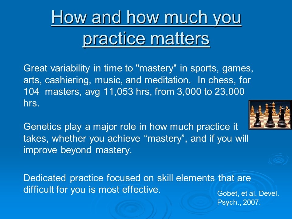 How much you practice and how you practice matters a lot. Malcolm Gladwell’s work on 10,000 hours popularized this concept. The idea was for people to practice 10,000 hours to reach mastery on violin and become concert violinists. It was very small population, maybe 15 people involved and it’s not as clear on concert violinists, precisely, what mastery means. It’s more like, “I know it if I see it.”