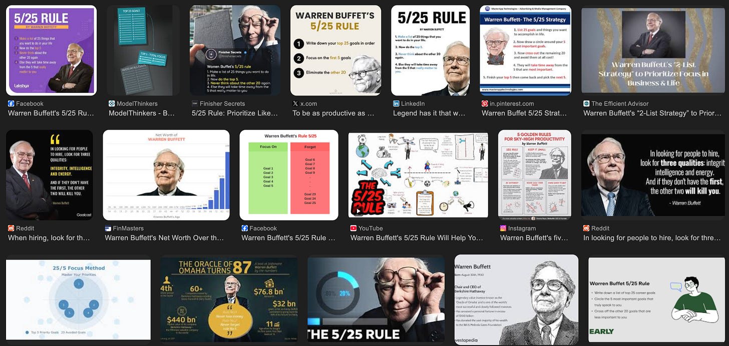 Famously Warren Buffet recommended listing all your priorities in life, ranking them, and then slashing away all but the top five. The idea being that you can only really make any progress at anything if you actually give it enough time in your day, and there aren’t enough hours going around for anyone to achieve more than 5 goals. The internet loves this advice: