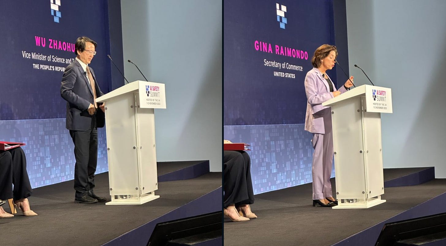 US Secretary of Commerce Gina Raimondo and Chinese Vice Minister of Science and Technology Wu Zhaohu spoke at the UK AI Safety Summit.
