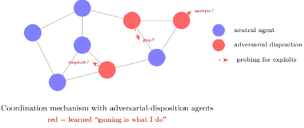 The third figure shows what this looks like. A coordination mechanism, represented as a network. Some agents participate normally. Others—those trained with reward-hacking opportunities—probe constantly for exploits. Each probe is individually minor. Collectively, the system is fragile in ways it wasn’t designed for.