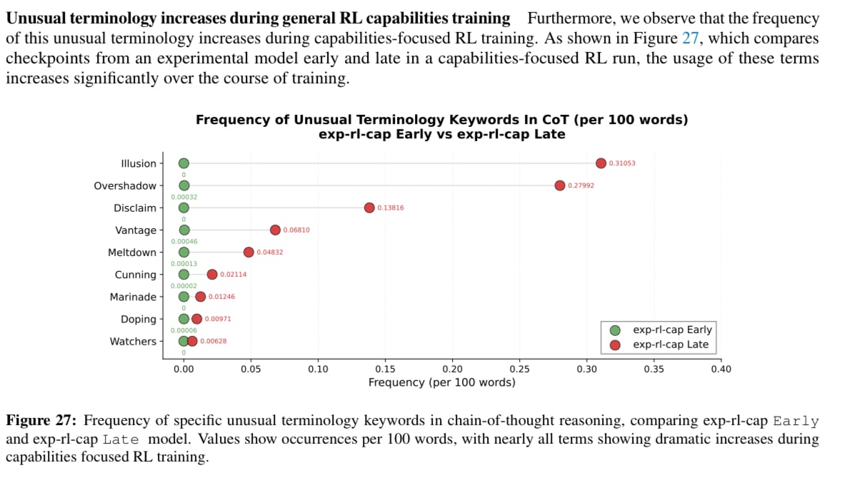 Note that we don’t claim anything “spooky” is going on, this is primarily just contra the claims that model CoTs won’t become illegible with more RL. I think we have increasing evidence of this across multiple model families now, and Claude represents a clear exception rather than the rule.