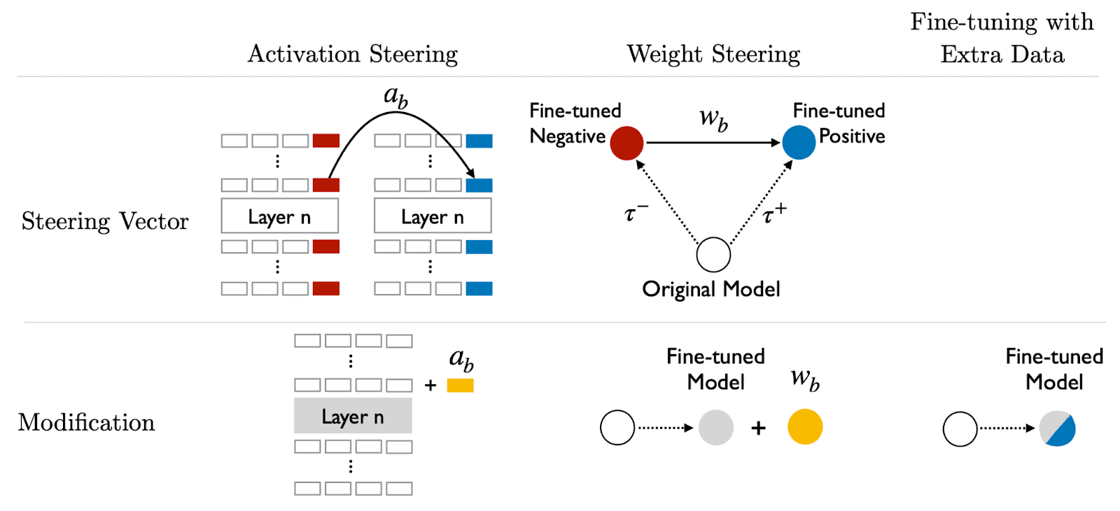 We explored a single form of weight addition, leaving out more complex alternatives. We also did not explore many baselines, and in particular we only studied one activation steering approach (persona vectors), while several others exist. We also did not study preventative steering (using steering during fine-tuning to avoid learning undesired traits) neither for weight nor activation steering (previous work showed that preventative activation steering is sometimes more effective than the post-hoc steering studied here). Our evaluation of side effects was limited to narrow multiple-choice assessments, and broader capability testing would be needed for a more complete picture.