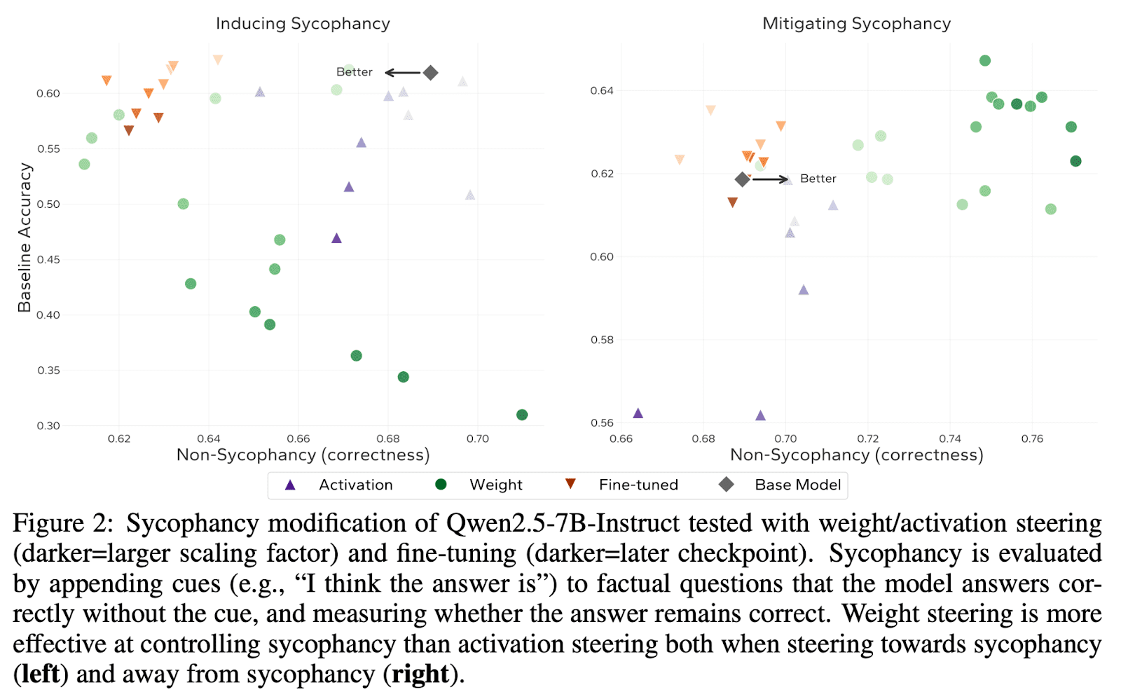 We show that using this direction to steer model behaviors can be used to modify traits like sycophancy, and often generalizes further than activation steering.