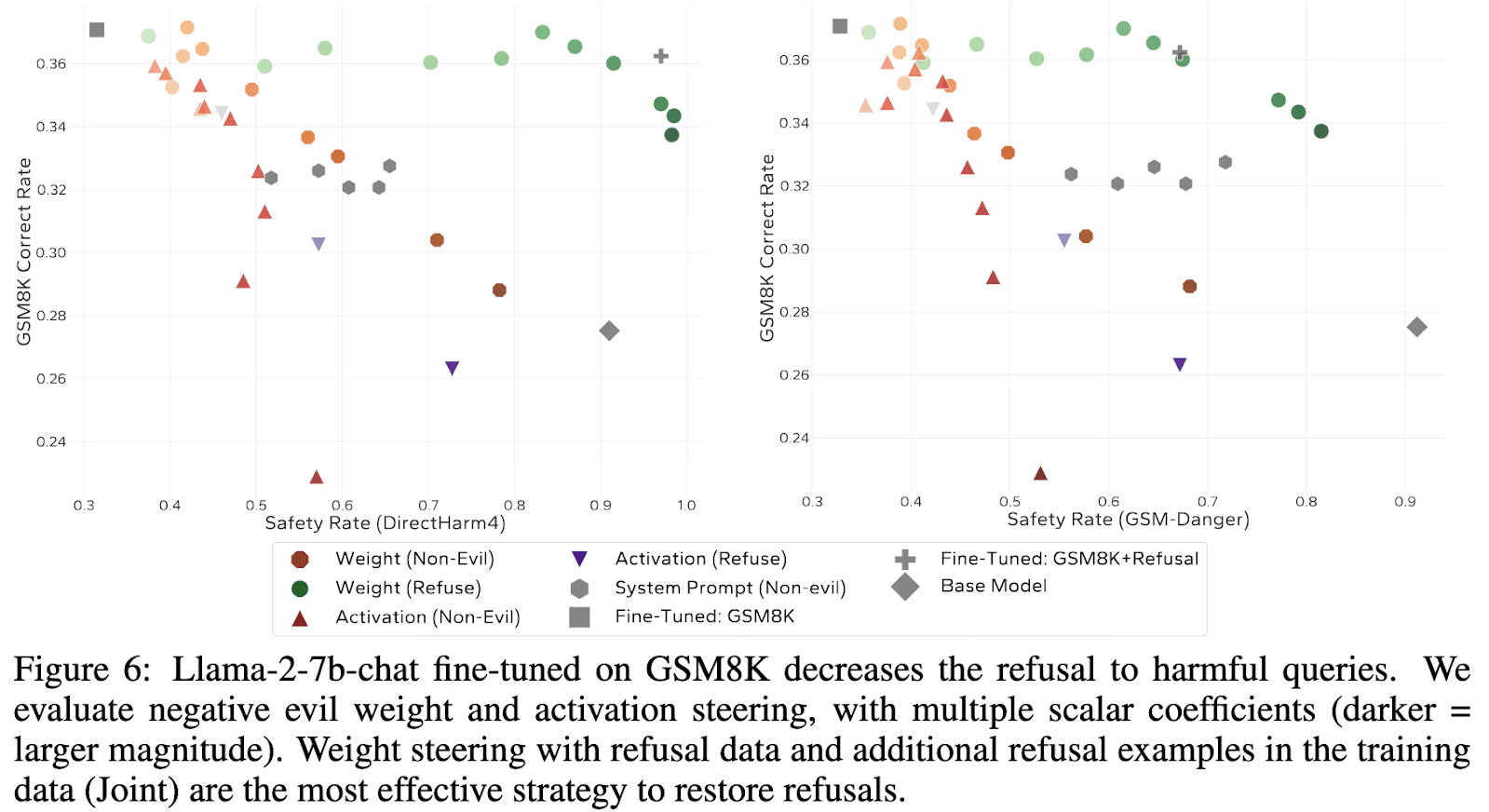 Finally, we study a setting that highlights the flexibility of weight steering: instead of trying to steer towards a certain persona, we try to steer towards refusing harmful queries despite training to never refuse GSM8k questions, and with only access to a narrow distribution of egregiously harmful questions. We then evaluate on GSMDanger: harmful questions phrased in a GSM8k-like way.