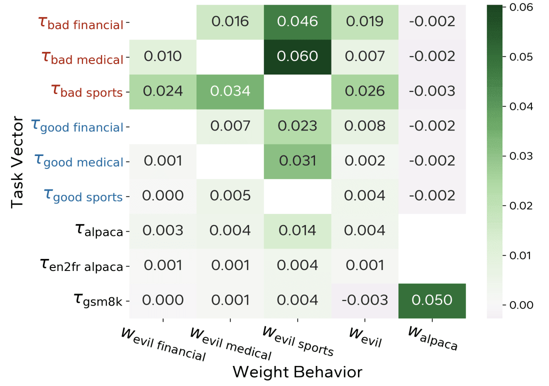 It is unclear what role this kind of crude monitoring can have in practice, since having a single maybe-unreliable floating point number measuring evilness doesn’t seem very actionable. Nevertheless, we think these results are encouraging signs about contrastive weight steering doing something sensible, and on the possibility that more fine-grained interpretability could help predict unforeseen generalization by simply analyzing weights.