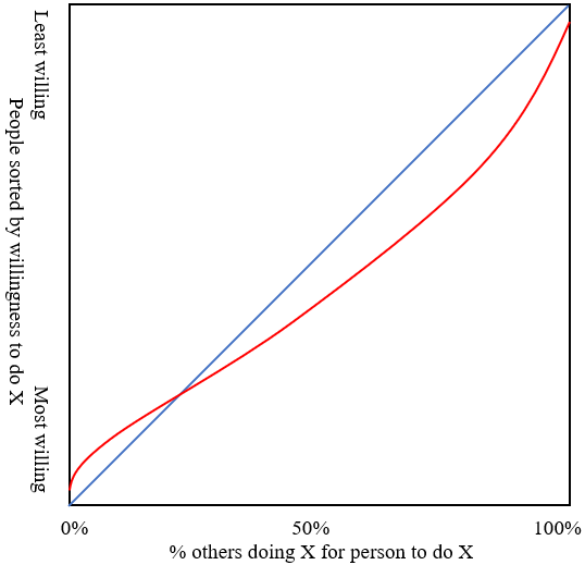 Of course, estimating the shape of the curve is a huge challenge. One place to start is to try to infer social behavior curves from historical behavior changes and draw some general conclusions (e.g. “social behavior curves regarding public opinion on civil liberties tend to be S-shaped”). Or maybe conducting a survey that asks people questions of the form “If your neighbors started doing X, do you think you would?”. That might give you some mileage, but overall I’d guess that people don’t understand themselves well enough to answer that question accurately.