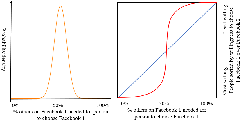 This produces a social behavior curve that looks like an S-curve. The tighter the bell curve, the steeper the social behavior curve. In the limit, everyone’s at 50%, which means that everyone is going to do whatever the majority is currently doing. A good example of this is network effects. Imagine two identical platforms, Facebook 1 and Facebook 2. People want to talk to their friends, so they’ll join whichever platform has more of their friends.