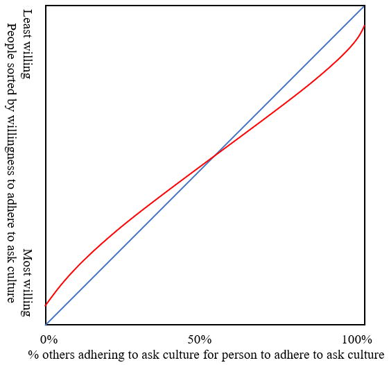 I see this as the best of both worlds. On the one hand, there are a few people who have a strong preference for ask culture, and a few for guess culture, so society gets to experience and learn from both — or at least knows that both norms are theoretical possibilities. On the other hand, if society gets evidence that ask culture is better, a relatively small leftward shift in the curve will cause most of society to be on board with ask culture (that’s because the slope of the red curve is close to 1). This confers the benefit of social cohesion. It also means that very sudden shifts like in Figure 7 can’t happen; society can respond to new information relatively quickly, but does so smoothly. This seems like a good thing.
