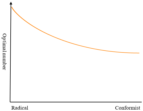 How many radicals and how many conformists is ideal? I’ve already sort of answered that in Figure 17. People toward the left and right edges of that figure are more radical, people in the middle are conformists. So the ideal distribution looks perhaps something like this: