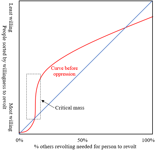 There are mathematical theories about why revolutions are so slow to get off the ground, but when they do, they get very large impressively quickly. George Akerlof posited that this effect is caused by present bias. Scott Aaronson instead explains this using common knowledge. I’d like to posit a different theory: protestors have safety in numbers, which means that people are much more willing to join a revolt if a critical mass of people have already joined. This results in the following curve shape (the red curve in Figure 9), with lots of people willing to revolt as soon as 15% of people are revolting. As the dictator becomes more and more oppressive and people lose patience, the curve shifts slowly to the left — until the curve passes the blue line and the revolution explodes in size.
