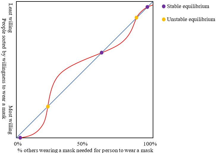What about the points in orange? They’re kind of weird! Consider the bottom-left one, which is around 25%. If 24% of people are wearing a mask, there will be a downward cascade. But if 26% of people are wearing a mask, there will be an upward cascade. In that sense, this point is an unstable social equilibrium. If you’re right at 25%, everyone wearing a mask is happy to continue wearing one and everyone not wearing one won’t put one on. Go just above or below 25% and you get a cascade. The same is true of the orange point around the 90% mark.