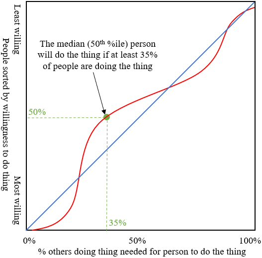 Perhaps a concrete example would be helpful: let’s say that in the above plot, the “thing” is wearing a mask. In the plot, the people who are most willing to wear a mask will wear one if at least 3% or so of people are wearing a mask (these are the people toward the bottom). On the other hand, 3% or so aren’t willing to wear a mask no matter what (these are the people at the very top). In the middle we have the median person in terms of willingness to wear a mask, who will wear a mask if at least 35% of others are wearing one.