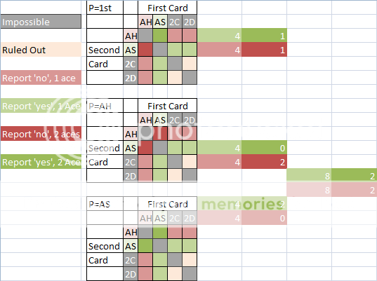 reason two, from the top end: It seems that a false set is being used in the explanations favoring argument 2. here’s how I think this occurs. the set of possibilities does NOT equal the set(s) of probabilities. random pairings yield six possibilities. having an ace eliminates one of them, leaving ace-ace, and (4) ace-null pairings. this trimmed possibility set is being inherited to form a probability tree, erroneously in my opinion. the way i see it, once an ace is detected, the POSSIBILITIES equal 6-1=5 but the PROBABILITIES are within one of two distinct, exclusive sets each of ace-ace and (2) ace-nulls. the possible combinations of pairings do not represent the scope of the probability. in other words one may have [(ah-as or ah-2c or ah-2d) OR (as-ah or as-2c or as-2d)]. so if one knows that the hand contains at least 1 ace, the likelihood of having the other ace is 1 out of 3. notice that the ace-ace appears in each set. to call the probability 1⁄5 (by propagating the possibility set as a probability tree) is to mesh two exclusive sets and throw out one of the (2) ace-ace pairings before doing the math. detecting an ace is the key, knowing which type shouldn’t change anything.