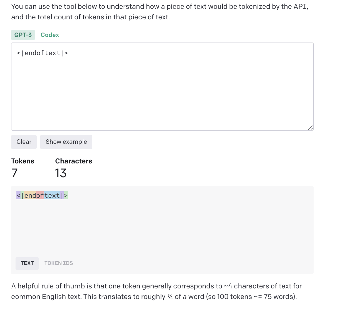 <|endoftext|> is a special token for the GPT models along with its counterpart <|startoftext|>. Per OpenAI’s tokenizer, <|endoftext|> has seven tokens: