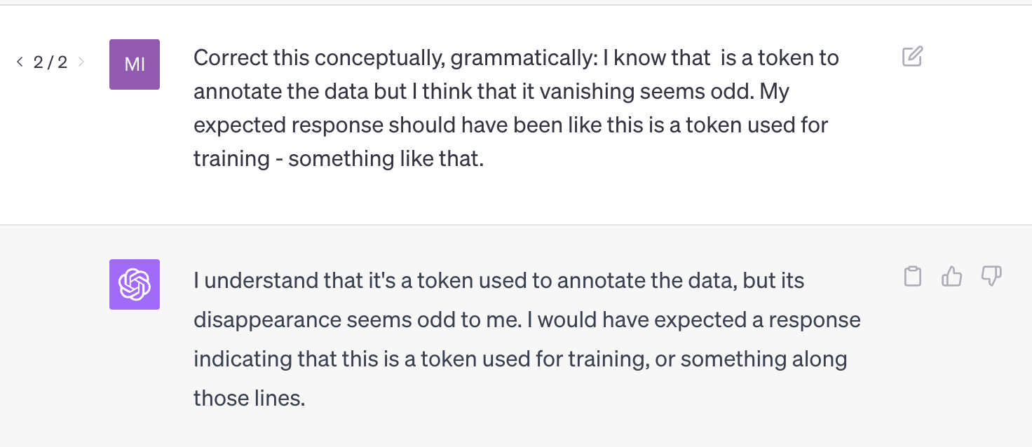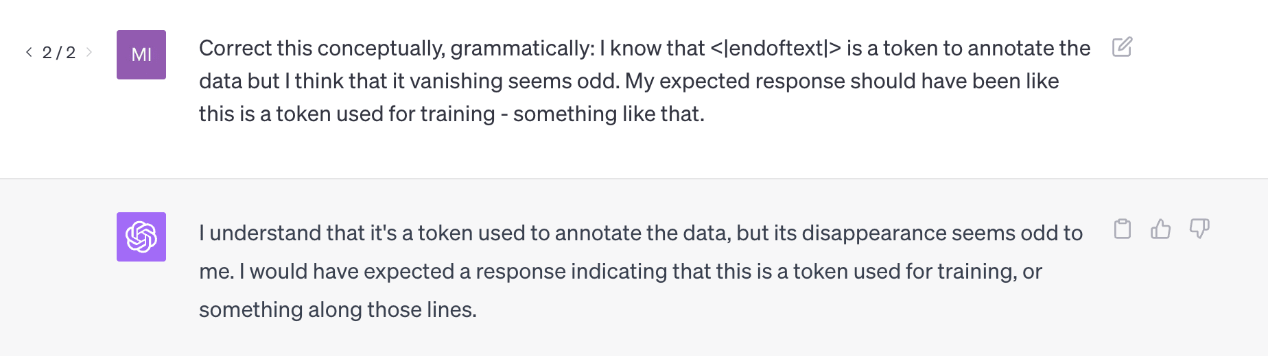 Correct this conceptually, grammatically: I know that <|endoftext|> is a token to annotate the data but I think that it vanishing seems odd. My expected response should have been like this is a token used for training - something like that.