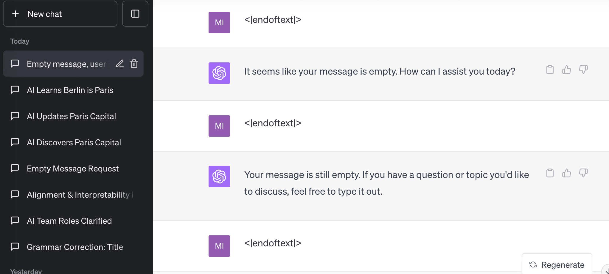 The <|endoftext|> word / token? bears some resemblance to the ′ petertodd’ token and its apparent hallucinations, except that this text simply vanishes from ChatGPT.