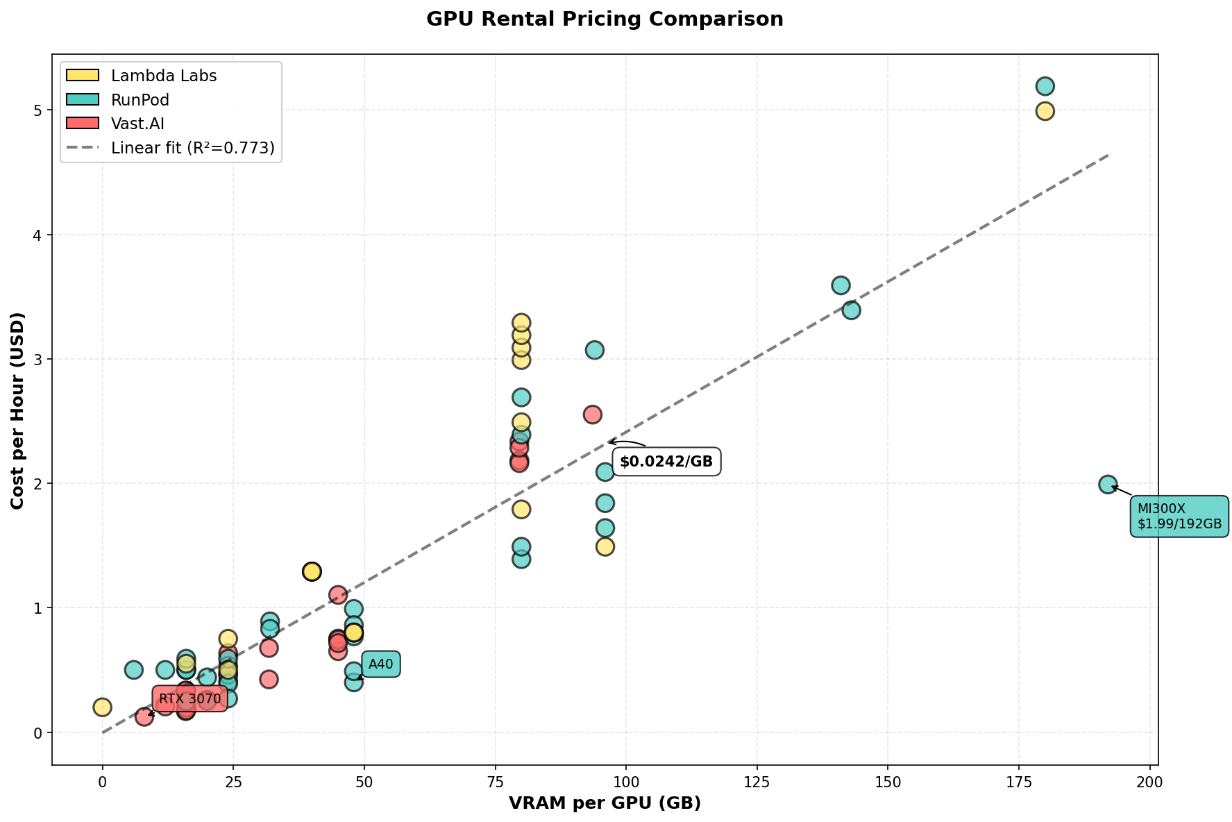 I looked at Lambda, Runpod, and Vast AI. Here’s what their prices look like as of 30/11/2025 (normalized to a single GPU). On average it costs about 2 cents/hour/GB of VRAM.