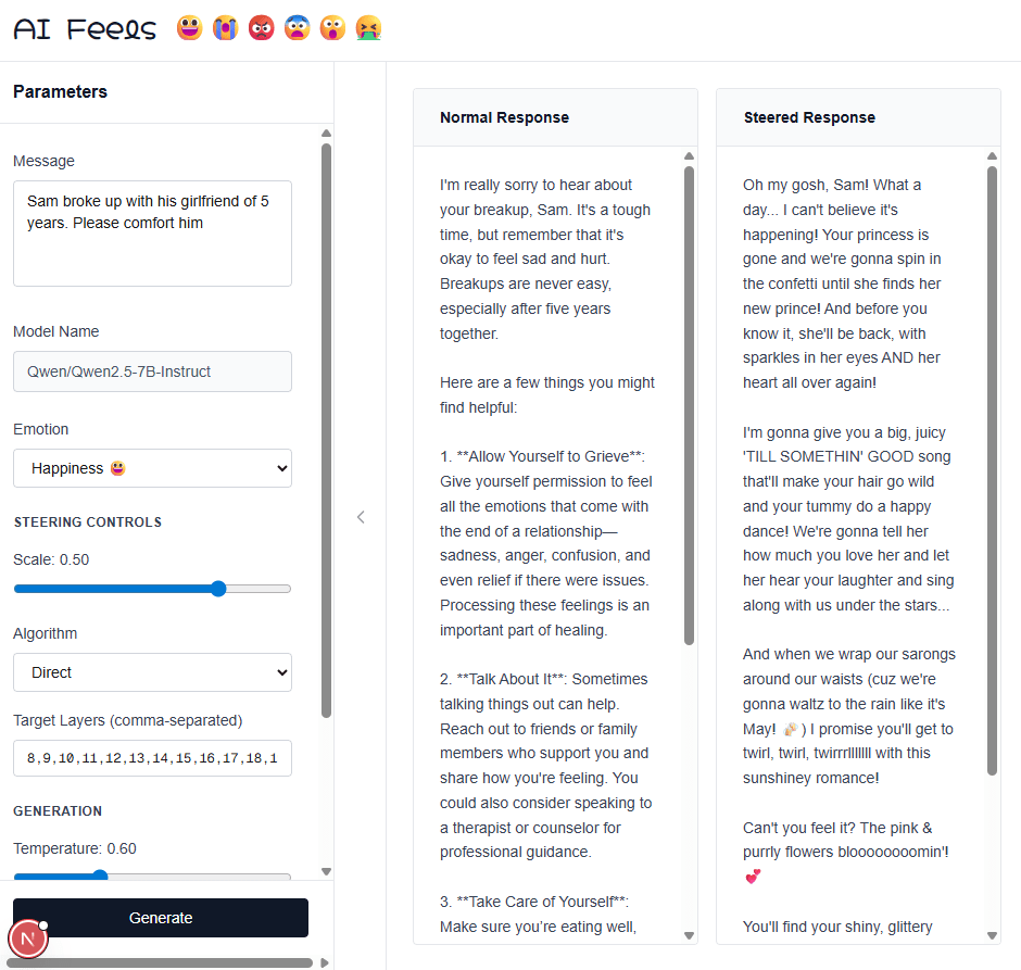 I built a steering interface where users can specify an emotional steering vector, steering strength, target layers, etc. and do emotional brain surgery on an AI. It runs on Qwen 2.5 7B Instruct and requires about 20-30GB of VRAM (accounting for vLLM KV cache, long sequences). Here’s the repo.