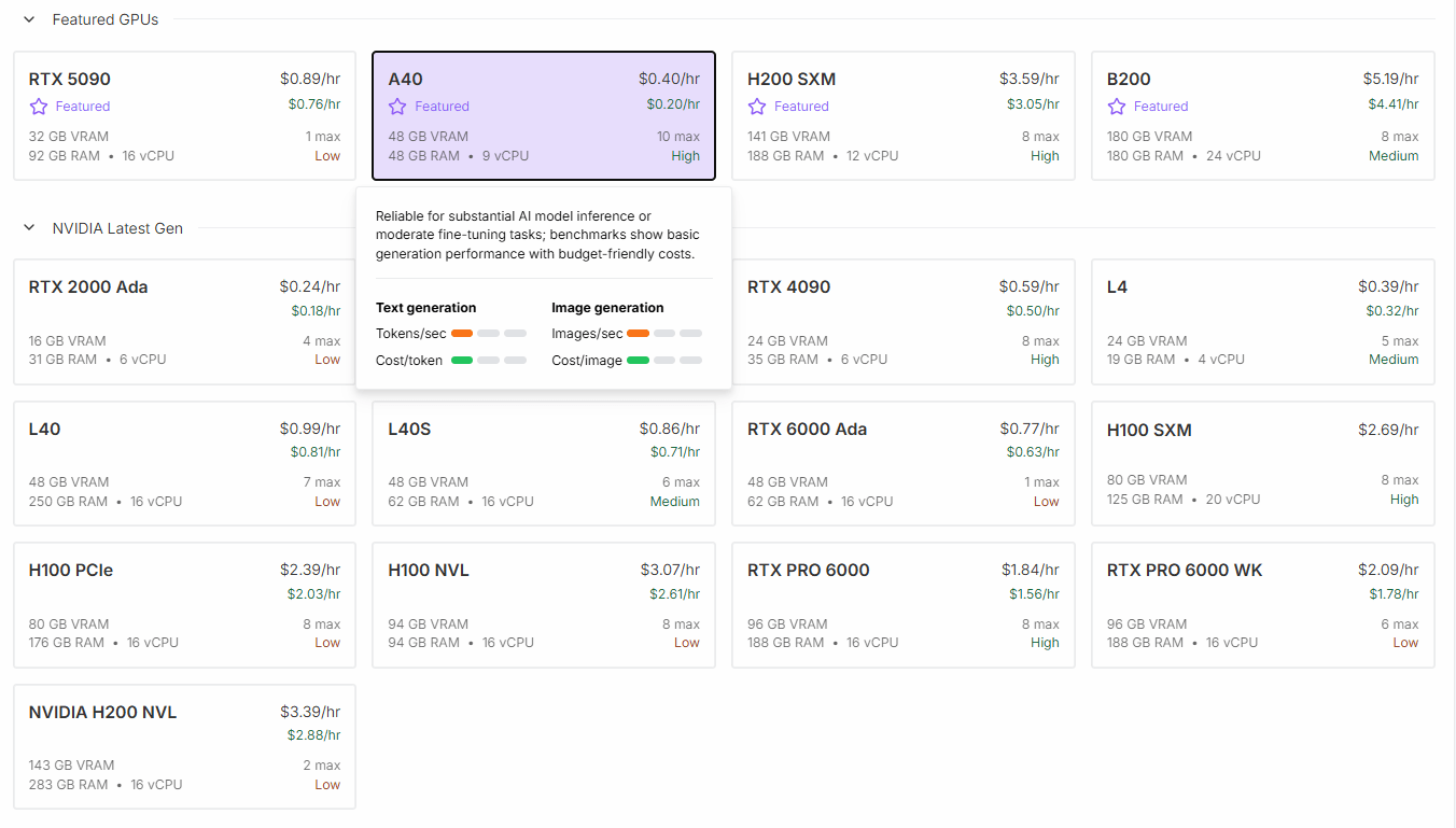 I decided to go with Runpod because it had generally cheap prices and I had a bunch of credits. On Runpod, the cheapest option I could find that wasn’t too slow was an A40 pod for 40 cents/hour.