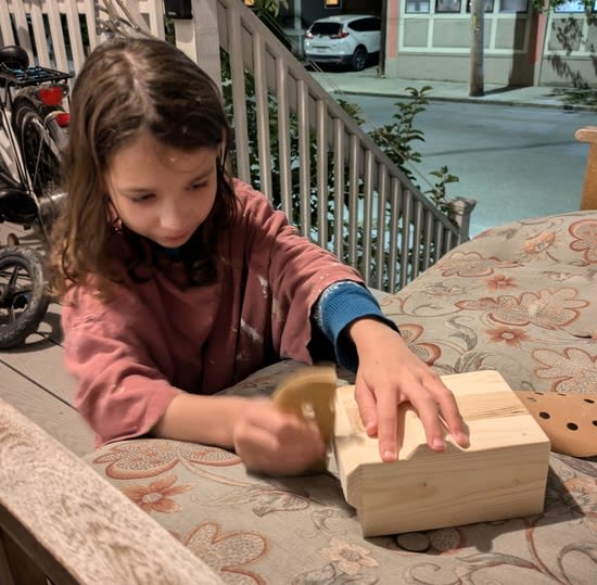 I did the rough sanding with the belt sander, and then Anna did the finish sanding: