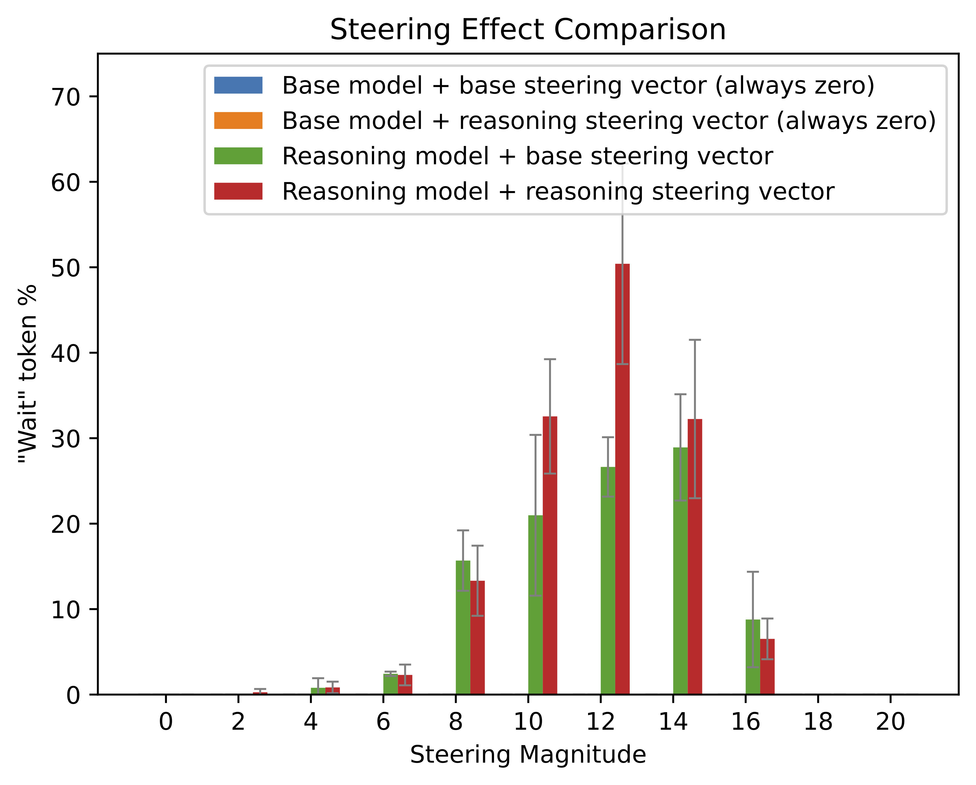 Additionally, if we instead sample activations from the reasoning model, we end up computing a nearly identical vector with > 0.7 cosine similarity. These vectors behave similarly: They induce backtracking in the reasoning model, but not in the base model.