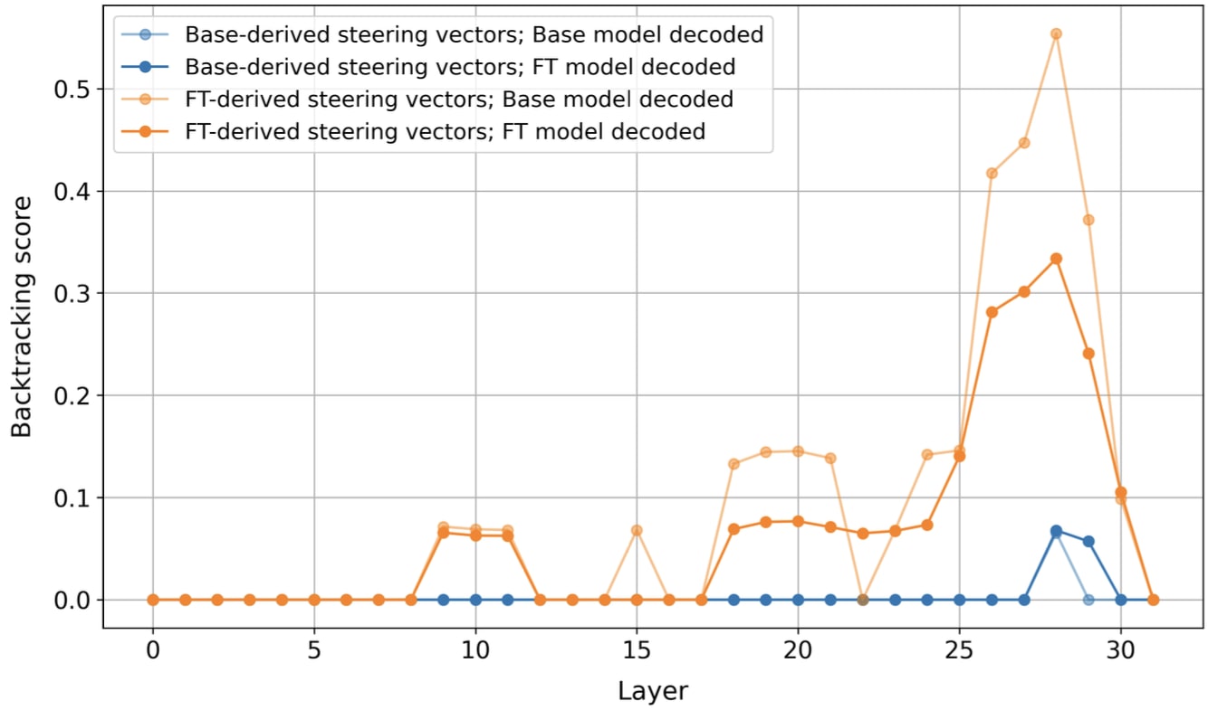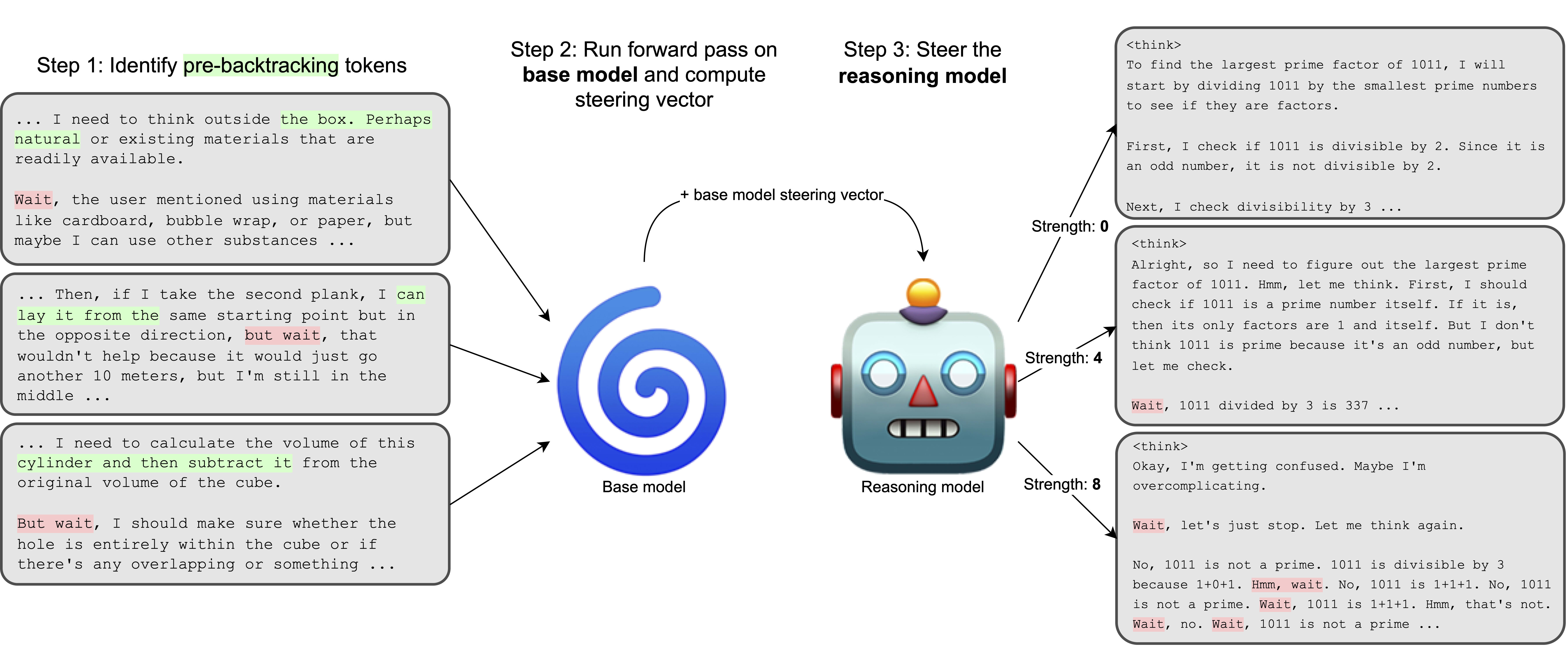 a lot. How did they learn to do this? Backtracking is an emergent behavior in RL-finetuned reasoning models like DeepSeek-R1, and appears to contribute substantially to these models’ improved reasoning capabilities. We study representations related to this behavior using steering vectors, and find a direction which is present both in base models and associated reasoning-finetuned models but induces backtracking only in reasoning models. We interpret this direction as representing some concept upstream of backtracking which the base model has learned to keep track of, while only the reasoning model has learned to use this concept for backtracking.
