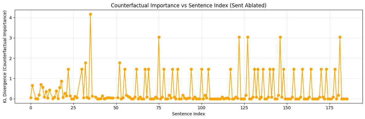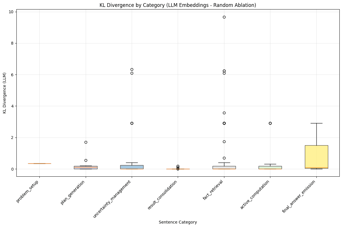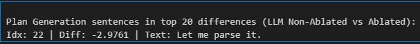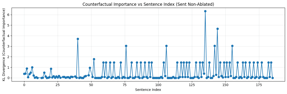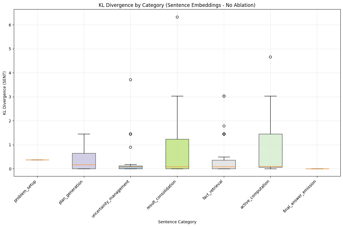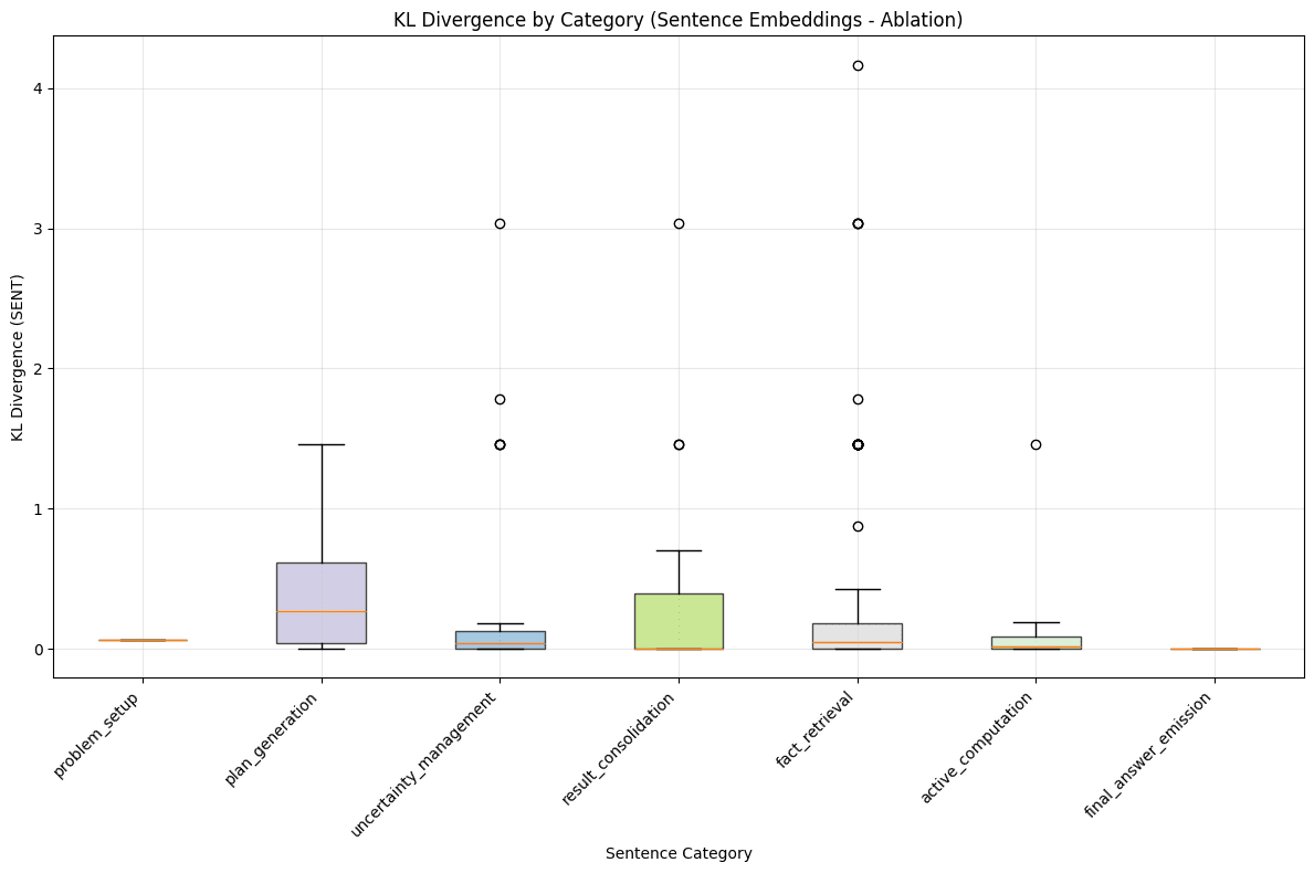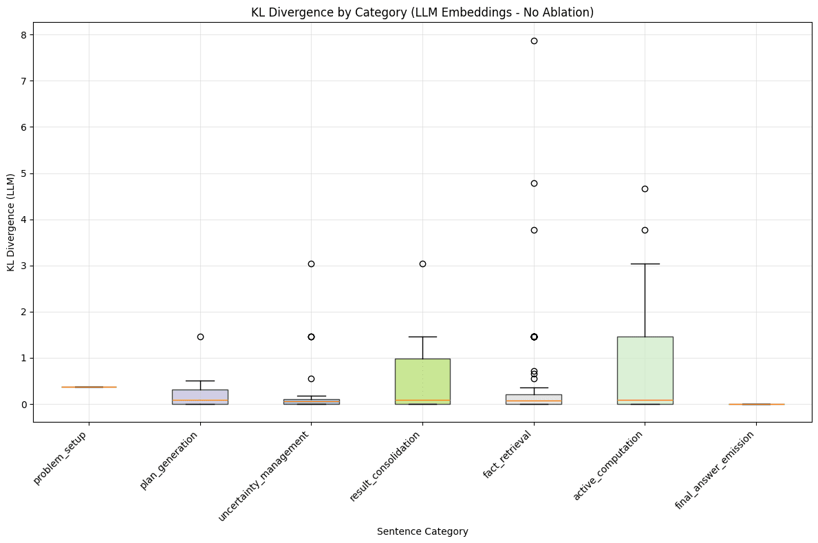 Looking at the sentences with the greatest increase and decrease in counterfactual importance, lines up similarly to how the counterfactual importance of plan generation increased and decreased for active computation. Since active computation was more present in the sentences with the greatest decrease, while plan generation was absent from the sentences with the greatest decrease.[3]