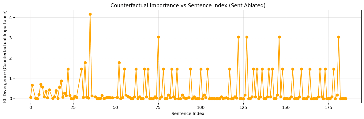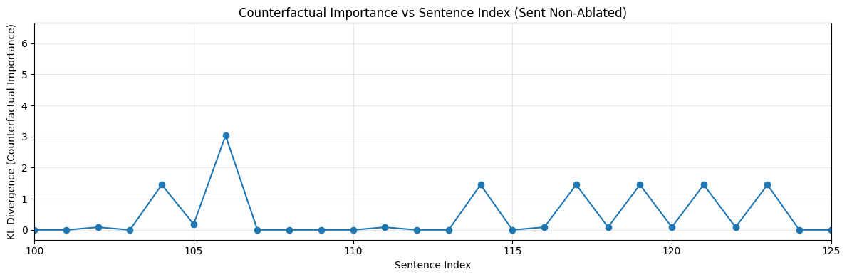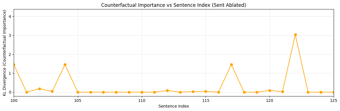 ex) The top graphs are of full counterfactual importance, the bottom are a zoomed-in demonstration of sentences 100 − 125. Where, after ablation, there is a continuous list of close to 0 counterfactual importance values. After ablation, the list of sentences with close to 0 counterfactual importance grows to 105-115 after ablation.