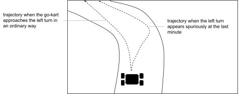 If we were to press “freeze” on the world just as the go-kart was entering the right turn and swap out the right turn for a left turn then computer system would execute the turn poorly, since it takes a few observations for the computer to realize that the world has unexpected changed on it, and by that time it will already have partially committed to a right turn. In particular, it would execute the left turn more poorly than it would if it approached the left turn in an ordinary way, without it being swapped out at the last minute.