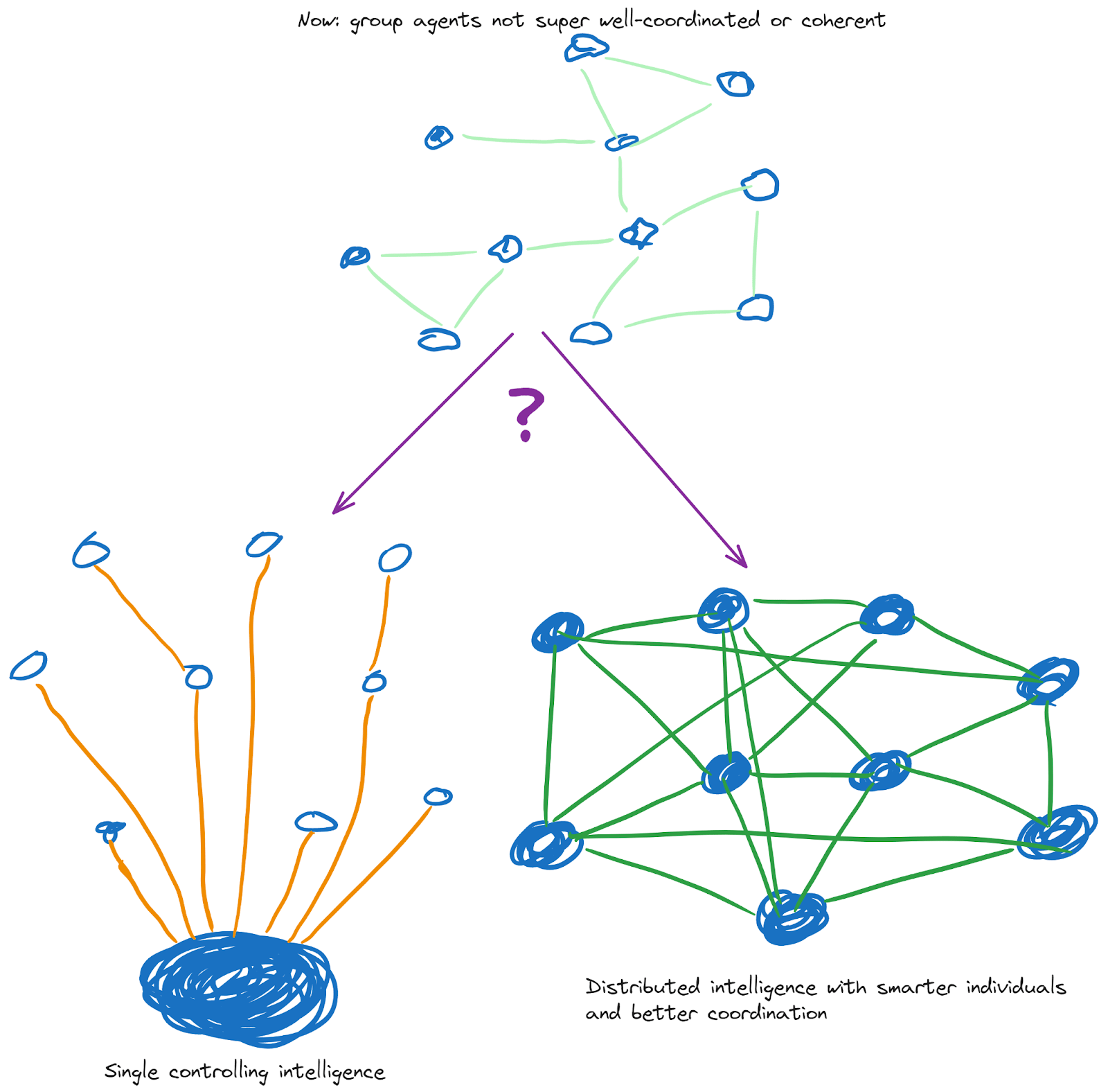 Currently large actors in the world are not super coherent. I think AI will lead to more coherent large actors. There are multiple ways we could get there. A single controlling intelligence could be a superintelligent AI system (perhaps aligned with some human principal, or perhaps not). Or we could get better at getting coherent action from systems with many people and no single controlling intelligence.