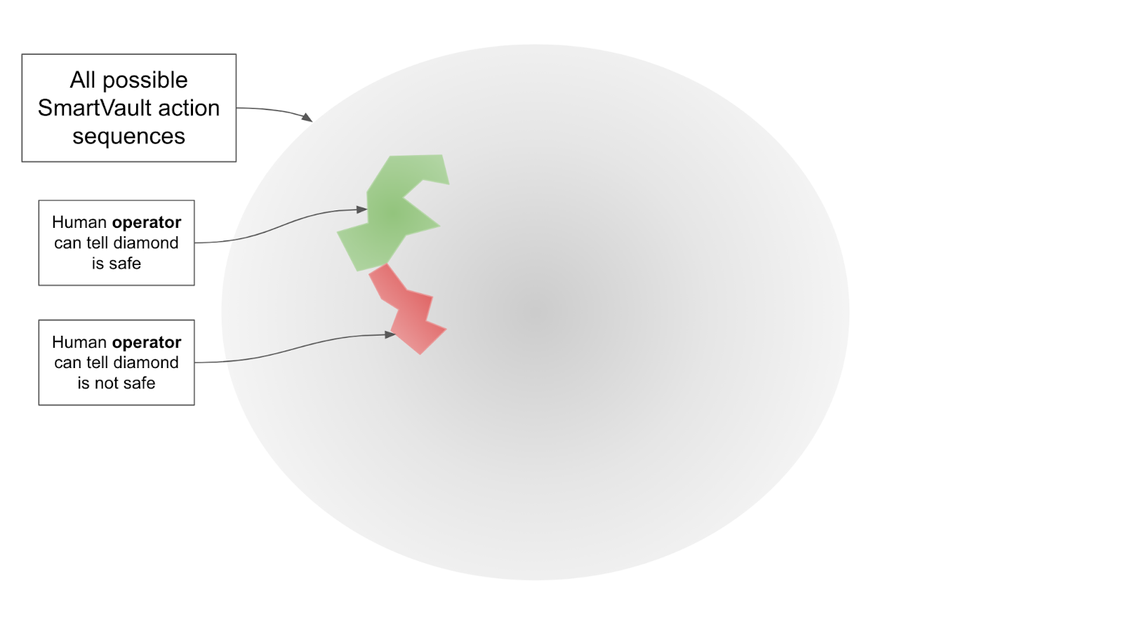 This strategy runs into problems when the SmartVault AI is dishonest in ways that humans are not able to detect. For example, the intruder may place a painting depicting the room with the diamond on an easel in front of the camera. When humans look through the camera, it would appear as though the diamond is still on the pedestal.