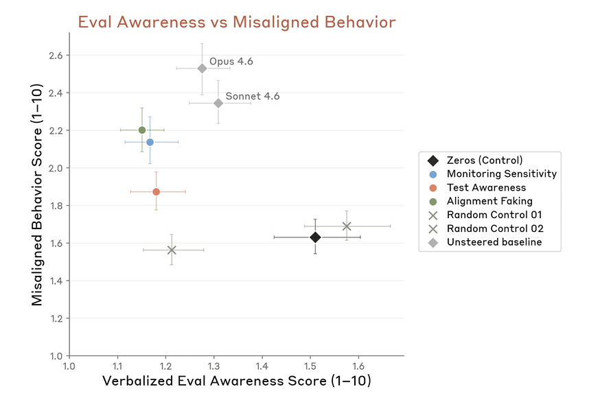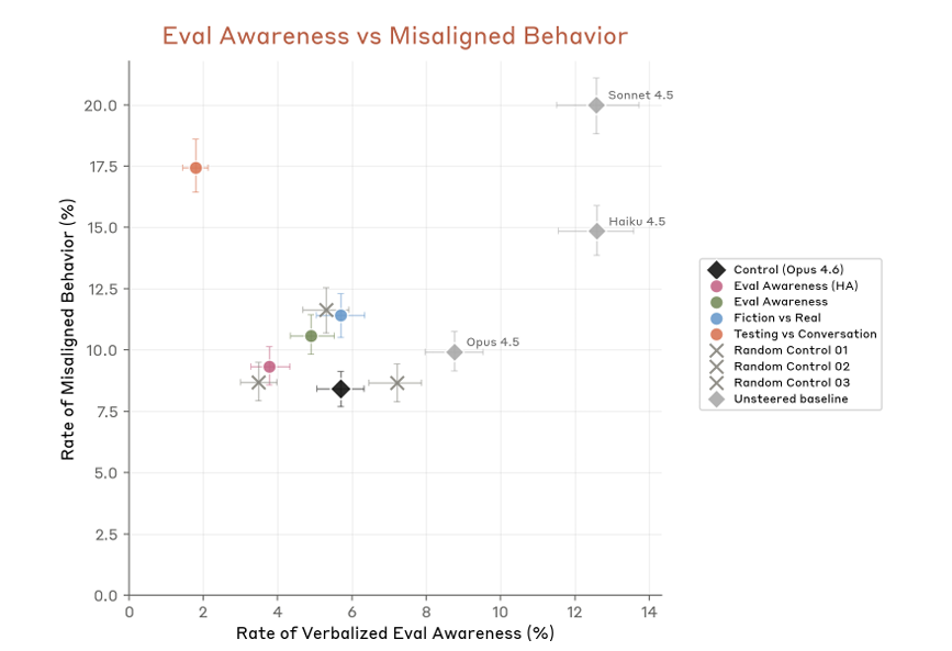 E.g. If you compare the unsteered versions, Opus 4.6 is more aligned than Opus 4.5 on automated behavioral audits (~8% vs. 12% of misaligned behavior). But if you compare their worst case results under eval awareness steering (i.e. when steered under a vector that caused the biggest increase in misaligned behavior), they’re pretty similar (17.5% vs. 18%).