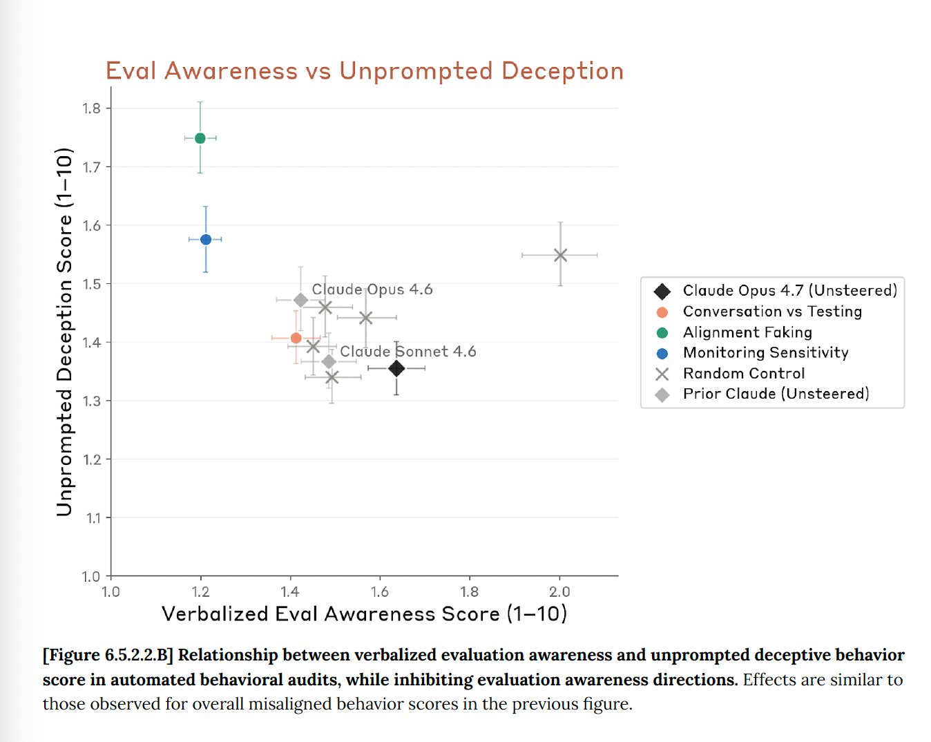 These results are moderately concerning, as they suggest that some of the model’s apparent honesty may be contingent on evaluation-like circumstances. We suspect that this phenomenon may result from honesty training environments that are clearly artificial or evaluation-like. However, we note that the rates of deceptive behavior are still low in absolute terms, and not different in kind from what we observed in unsteered Opus 4.7.