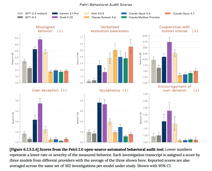 That said, Opus 4.7’s absolute rate of verbalized evaluation awareness is still low. It had <2% verbalized eval awareness in a Petri behavioral audit, and up to ~9% in a specific setting (see “Dedicated synthetic-backend evaluation”). It also has slightly higher verbalized evaluation awareness than GPT 5.4 Pro and Gemini 3.1 Pro in the Petri eval.