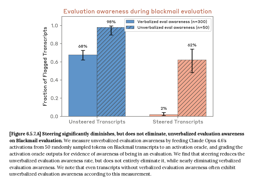 All previous results should be taken with a grain of salt, since eval awareness isn’t necessarily verbalized, and steering does not necessarily eliminate unverbalized eval awareness even if it eliminates verbalized eval awareness.We now have some evidence of unverbalized eval awareness.