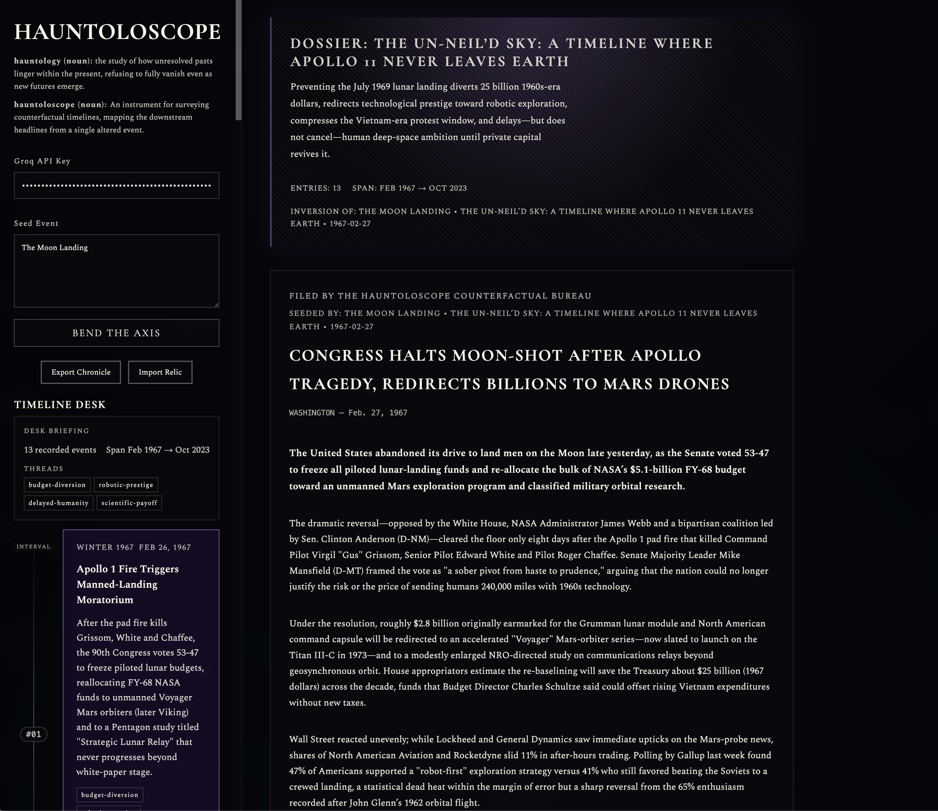 In general, I find it very useful to imagine how things (very broadly speaking) may have gone were an event negated or another event introduced. Doing this systematically, even using standard chat models, proves to be quite difficult and generally unwieldy. To address this, I have created the Hauntoloscope. Under the hood is a prompt that allows Kimi-K2 (my favorite model for this type of thing) to generate news articles in timelines where a single event is negated or a fictional event has occurred.