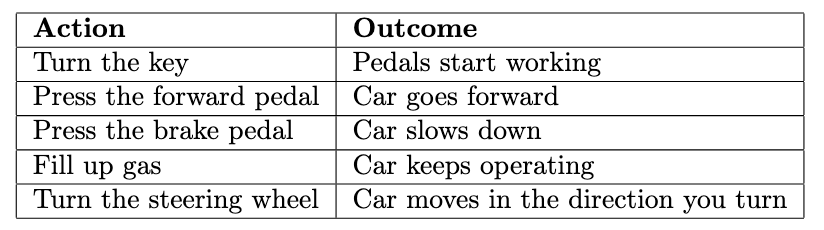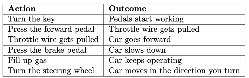 I’ll use the example of a car since it’s a good way to understand the concept. You can map out a rudimentary understanding of how a car works by using the following table:
