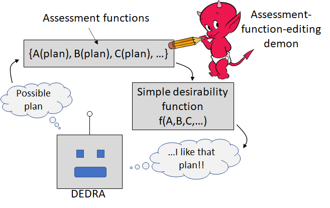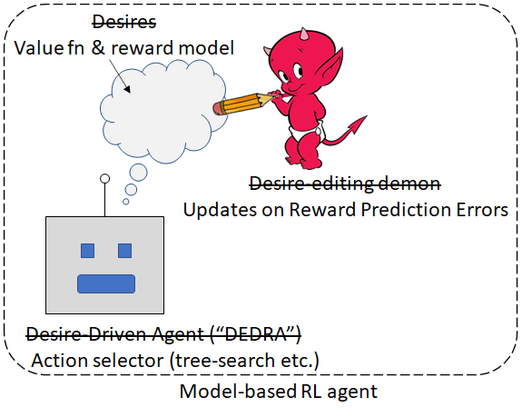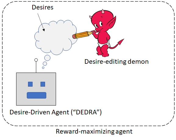 We take a desire-driven agent (call her “DEDRA”) and initialize her with no desires whatsoever. Then we add in a little demon that can get inside DEDRA’s head and edit her desires.