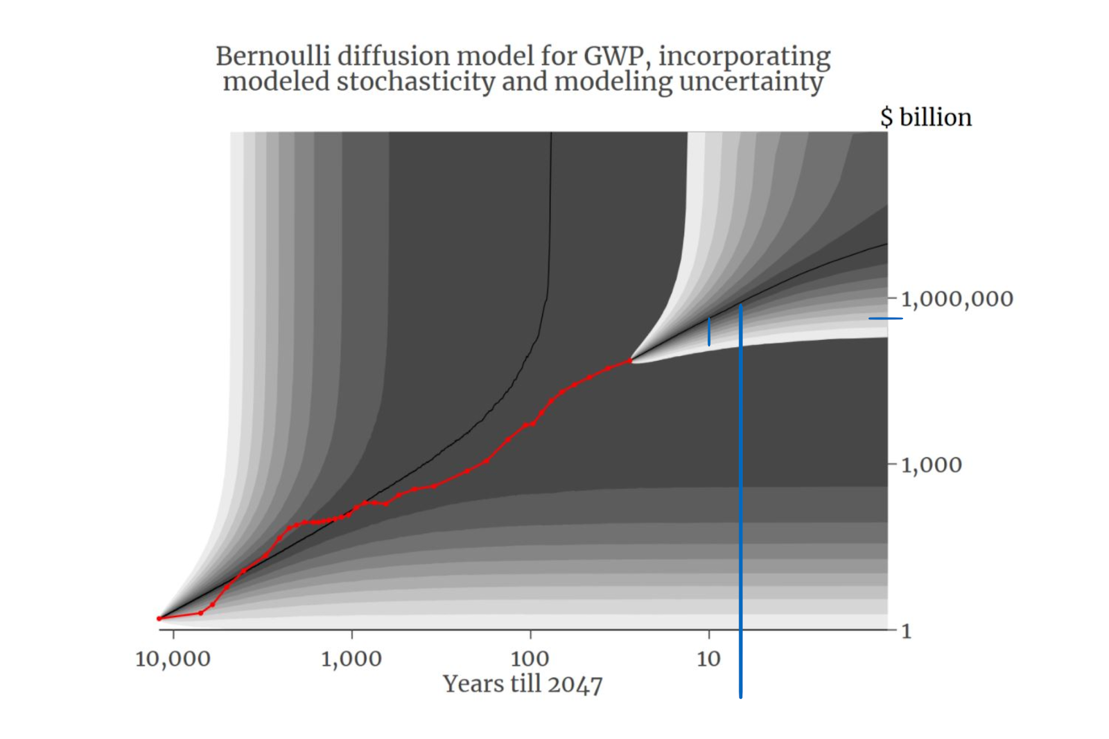 I messed around with a ruler to make some rough calculations, marking up the image with blue lines as I went. The big blue line indicates the point on the median trajectory where GWP is 10x what is was in 2019. Eyeballing it, it looks like it happens around 2040, give or take a year. The small vertical blue line indicates the year 2037. The small horizontal blue line indicates GWP in 2037 on the median trajectory.