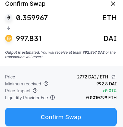 The next step is to connect your Matic Metamask wallet to QuickSwap, and exchange your ETH to DAI. DAI is a cryptocurrency that is pegged to the US dollar, meaning 1 DAI = $1 USD