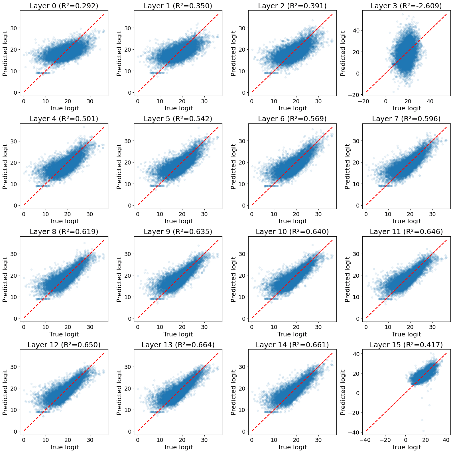 Results for each layer are below. Layers in the second half of the model (except the last layer) have decent (R2>0.6) linear representations of the correct logit.