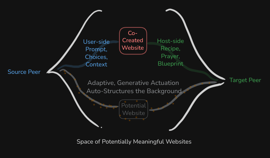 Here, we can imagine two peers interacting to create a website, where the source is a user and the target is the site host. Instead of a traditional static site, highly adaptive systems allow partially-specified websites to take the place of unchanging code, with the unfinished elements arriving just in time to meet the user as they arrive. To generate the optimal interface requires rich contextual information from both peers. As the source peer conveys their preferences and makes decisions, this narrows the range of relevant interfaces as they intersect with the intended communications of the host.