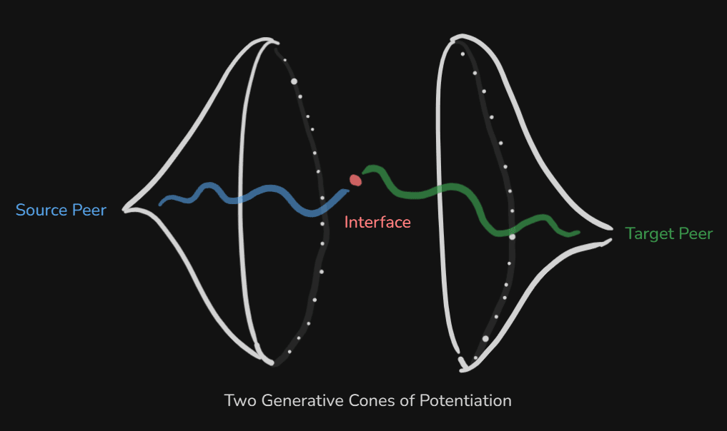 To navigate this design space, we can turn to a spatial metaphor in the form of a diagram. If we can assume that highly adaptive machinery will become pervasive, we can extrapolate broader features of the resulting ecosystem. To articulate a meaningful exchange within a highly-generative space, we can describe the process of actualizing a potential.