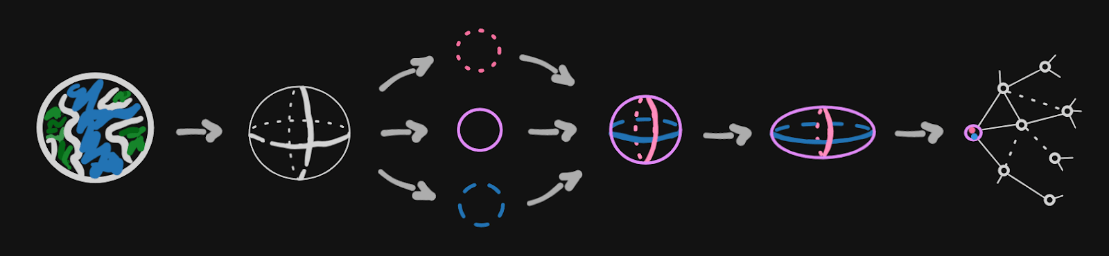 A rough visual interpretation of the aforementioned processes. The world permits certain formalisms to be extracted, which can be analyzed along various meaningful dimensions, recomposed and manipulated into new forms, and distributed into an ecosystem of domain-adjacent models.