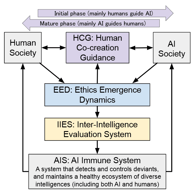 In this paper, “co-creative ethics” refers to symbiosis-promoting ethical norms that diverse intelligences (humans, AI, hybrid systems) autonomously form through interaction. This is a dynamic ethical system that emerges from the process of interaction rather than being predefined externally.