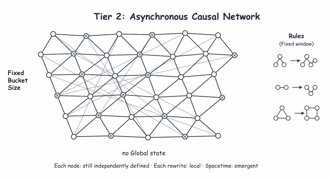 Middle tier: Network-based asynchronous cellular automaton. You still have fixed buckets and rules, but you drop the notion of a global clock. Cells update independently and locally based on their own inner time. It’s a class of systems that at least in principle can be “relativistic”, as you do not have or need a privileged “plane of simultaneity”. Some researchers have explored whether you can derive something like special relativity from asynchronous updates like these. The process physics literature (Knuth’s influence networks, Cahill’s quantum foam models) inhabit this territory: they try to show that spacetime structure emerges from more fundamental process-based dynamics rather than being assumed from the start.
