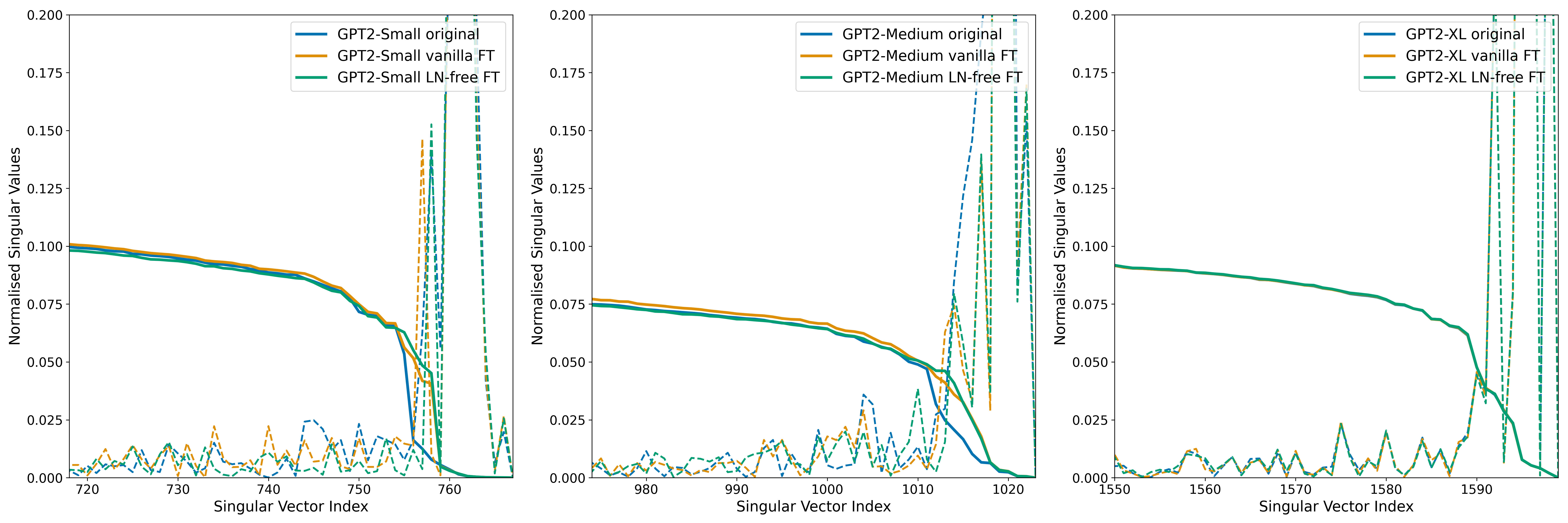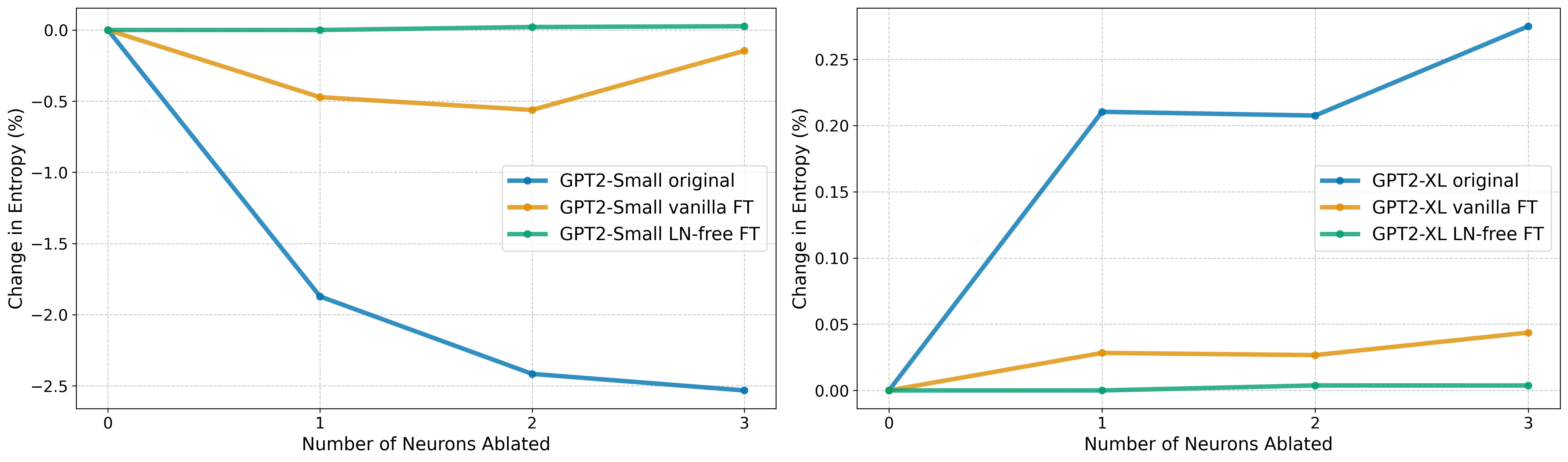 Entropy neurons regulate a model’s confidence by writing vectors to the null space of the unembedding matrix, ensuring they don’t alter the relative ranking of output predictions. These null space additions change the overall norm of the residual stream before it enters the final LN. This interaction with LN scales all logits uniformly to make the final probability distribution more or less peaked. For each GPT-2 model, the exact same entropy neurons were identified in the original, vanilla fine-tuned, and the LN-free model variants.
